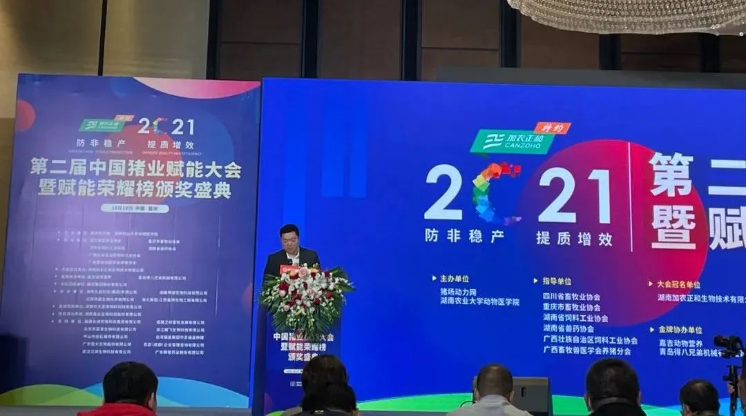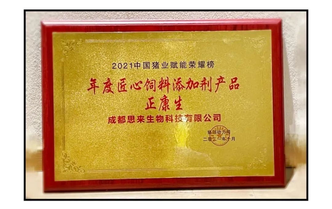 接著,會議第二項議程——“2021中國豬業(yè)賦能榮耀榜頒獎典禮”召開。本次頒獎典禮上,思來生物旗下產(chǎn)品——正康生®Plus榮獲“2021年度匠心飼料添加劑產(chǎn)品”獎項。