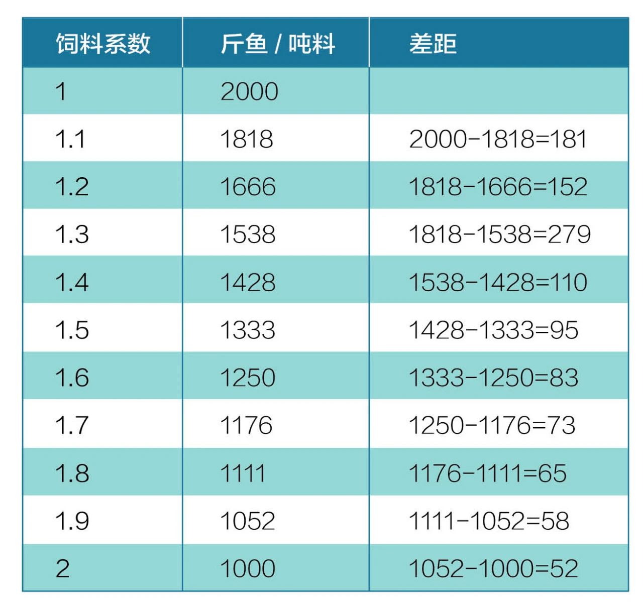 相同重量飼料,不同飼料系數情況下生產成魚產量也存在差距。從這個表可以看出,同樣的2000斤飼料,當飼料系數為1時,可以產出2000斤成魚;但飼料系數增加到2時,產出的魚只有1000斤。